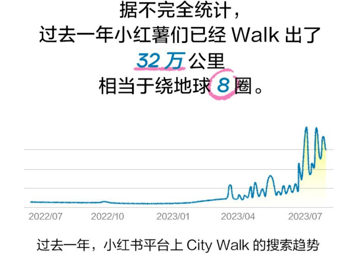 而在今年,City Walk的受欢迎程度则有过之而无不及,小红书出品的City Walk趋势报告中指出,2023年上半年,小红书平台上City Walk的相关搜索量同比增长超30倍,而其原因也不难理解。