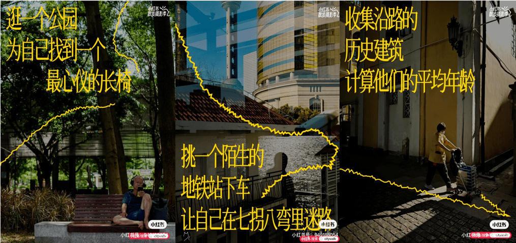小红书曾推出散步摄影季系列文案,将奇奇怪怪、可可爱爱的全民City Walk行为图鉴一网打尽,把City Walk随性自由的浪漫人文气息展现得淋漓尽致,也进一步凸显了品牌“生活方式引领者”的标签。