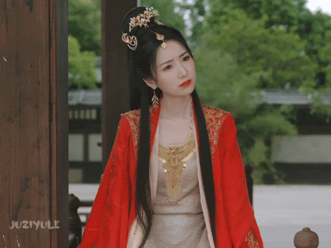毛晓彤饰演的北齐大公主一身红衣亮相,她坐在亭子边上若有所思,像是有什么心事。