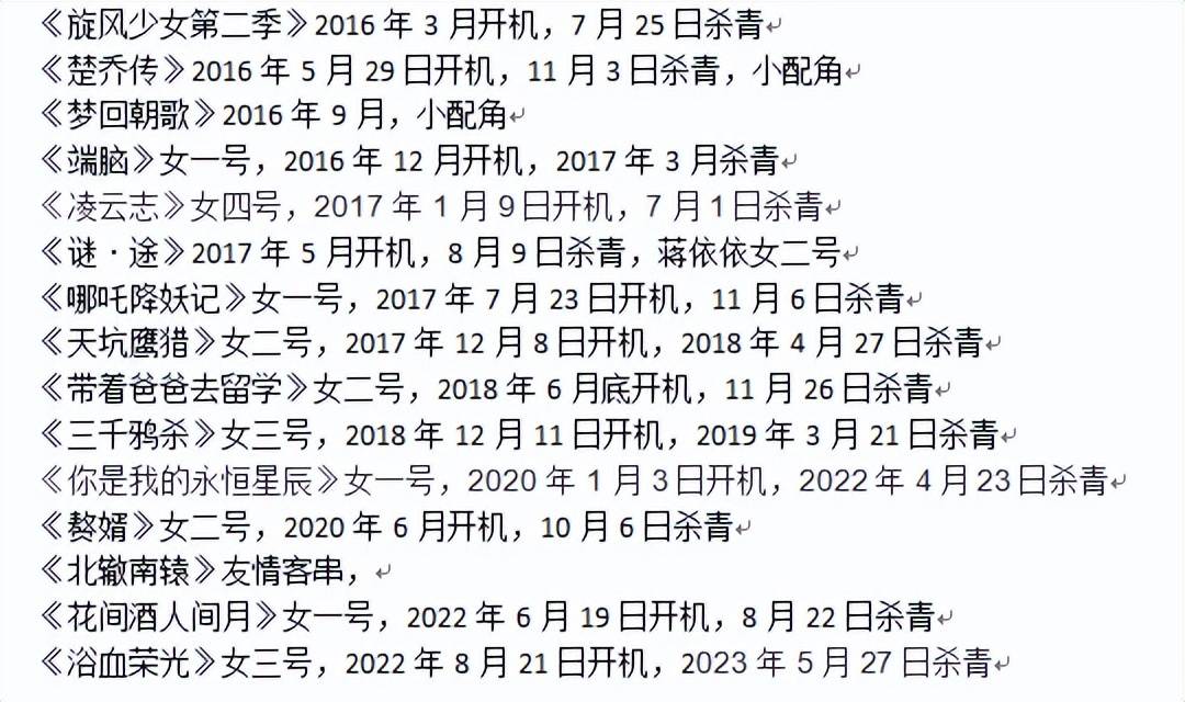 可能细心的网友会发现,蒋依依进组的时间线是有重叠的,没错,我们在梳理蒋依依2016年开始的作品开机、杀青时间线,会发现她确实有几次轧戏的情况发生。