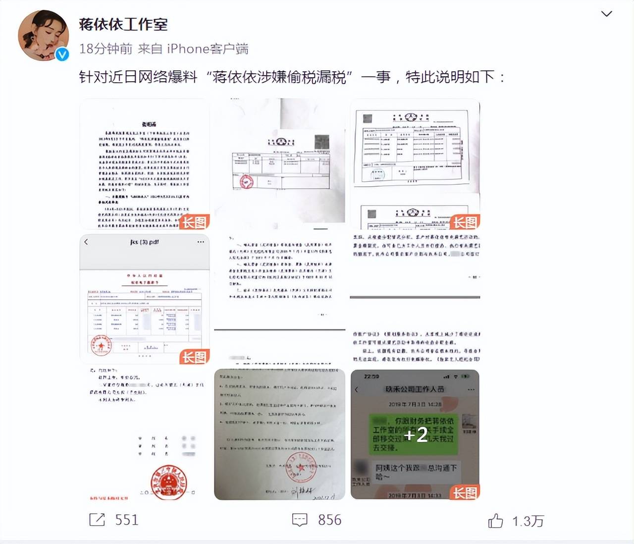 文字很长,总结重点,大概意思是承认“曾以自行申报的方式补缴蒋依依个人所得税及滞纳金”,但否认蒋依依偷税漏税,并在长文中解释“蒋依依工作室”为前经纪公司玖禾禧兆提出要求CIA注册,而财务方面的事项,也有经纪公司代为运作、操控,“全面管理蒋依依工作室财务工作”,甚至工作证照、印章、银行U盾、财务账册等重要物品也均由玖禾禧兆掌管,2021年工作室收到通知后,才安排专人前往长沙按照要求自省申报缴纳税费。