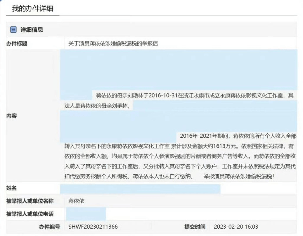 税务风波的前因后果理清了,值得讨论的是,举报材料所示,2016年-2021年期间,蒋依依的所有个人收入全部转入其母亲名下的永康蒋依依影视文化工作室,累计涉及金额大约1613万元。之后,举报蒋依依的当事人又发了情况补充,这238万只是蒋依依2017年-2018年的税金及滞纳金。