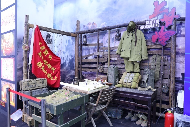 展会现场,“北京大视听”复刻了中国人民志愿军十五军行进过程中的临时指挥所,时任十五军军长秦基伟在此指挥了朴达峰战斗。展台用做旧木板隔出一个小空间,陈设了剧中多个实拍道具:沙盘、军用水壶、弹药箱、地图、军用电台、志愿军指战员服装等,为参观者增加身临其境的代入感,仿佛亲历一场当年艰苦卓绝的战斗历程。