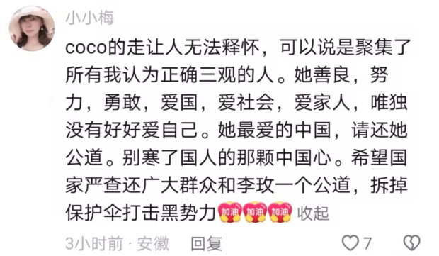 coco的走让人无法释怀,可以说是聚集了所有我认为正确三观的人。她善良,努力,勇敢,爱国,爱社会,爱家人,唯独没有好好爱自己。她最爱的中国,请还她公道。别寒了国人的那颗中国心。希望国家严查还广大群众和李玫一个公道,拆掉保护伞、打击黑势力!