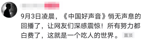 9月3日凌晨,《中国好声音》悄无声息的回播了,让网友们深感震惊!所有努力都白费了,这就是一个吃人的世界。