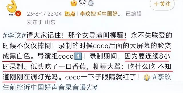 最开始关于柳骊的爆料,是有人说节目录制8小时,李玟撑不住低头吃了一口香蕉,结果被柳骊训斥了。
