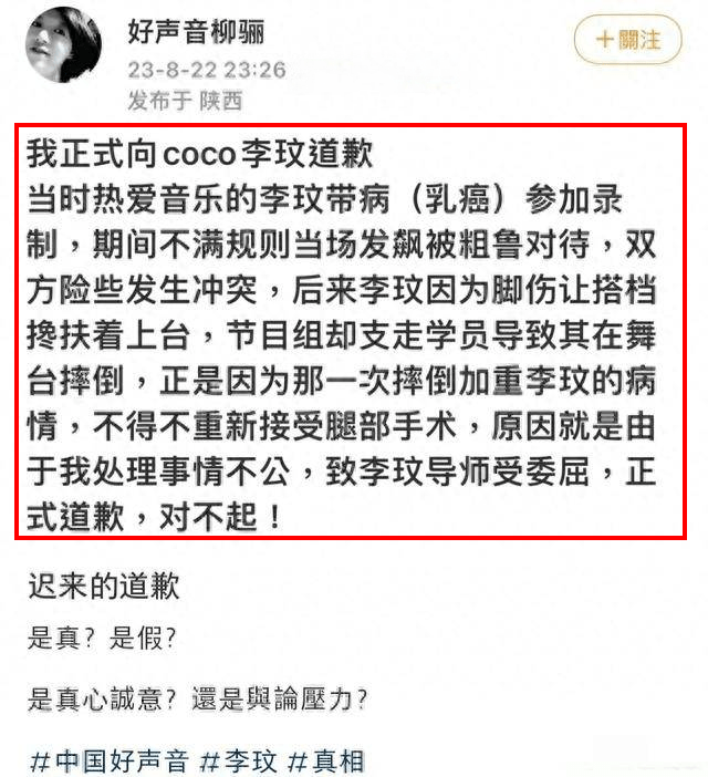 浙江广电集团出面回应后,浙江卫视给《中国好声音》按下了暂停键,互联网上又传出了柳骊向李玟道歉的消息。