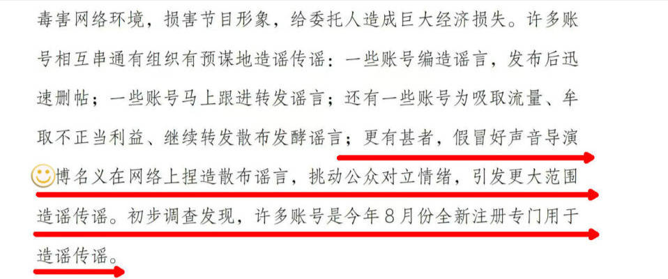 而这一次北京市两高(上海)律师事务所发出的声明中,明确指出有人假冒《中国好声音》导演在网络上捏造散布谣言,挑动公众对立情绪,引发更大范围造谣传谣。