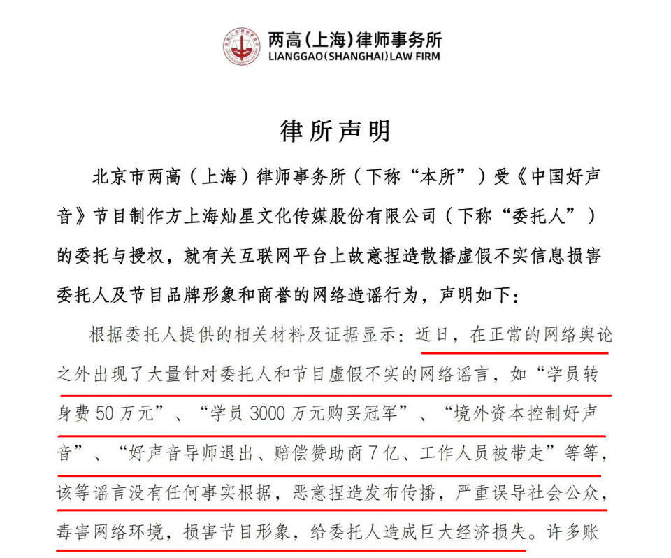 作为《中国好声音》的节目制作方,“灿星文化”委托北京市两高(上海)律师事务所发出声明。