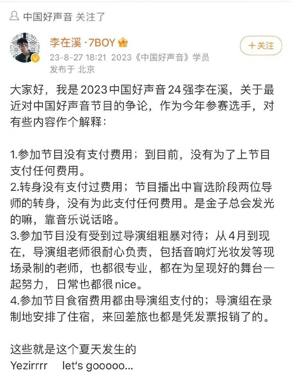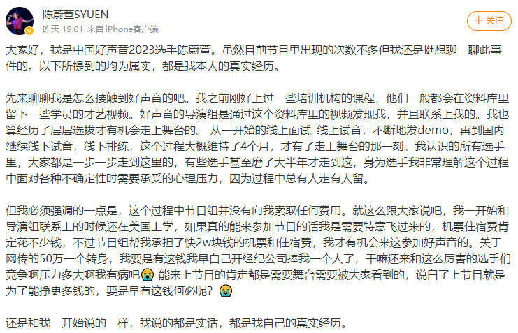 面对这些问题,首先是好声音学员齐发声,称并未被收取任何费用。