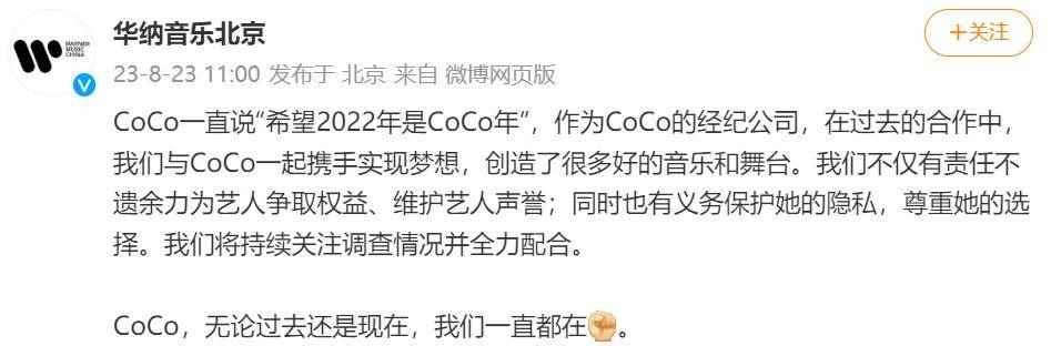 8月23日,李玟经纪公司华纳音乐发声表示将持续关注调查情况并全力配合。