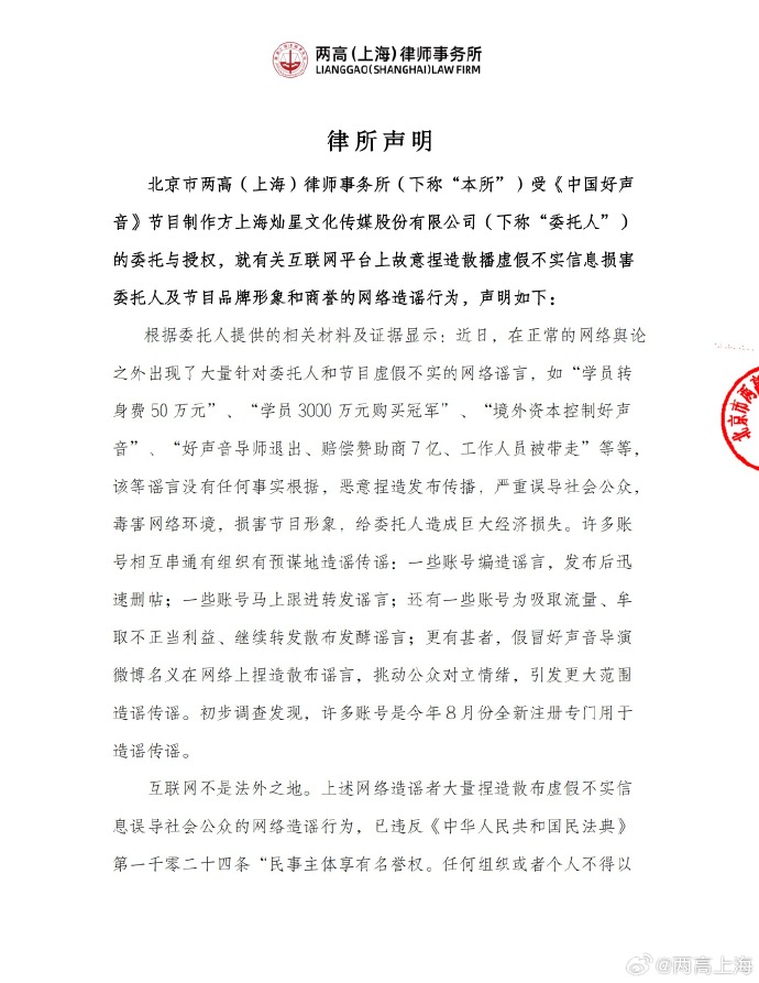 最后就是好声音制作方再度回应,发出律师声明,指出网传的学员转身费50万元、学员3000万元购买冠军、境外资本控制好声音、好声音导师退出、赔偿赞助商7亿、工作人员被带走等都是谣言。