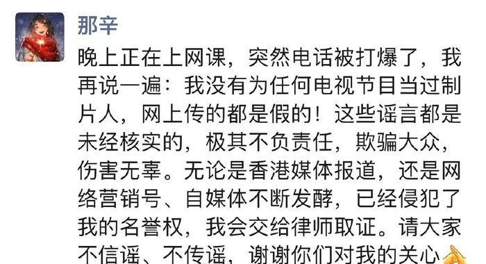 那辛发文否认被捕,更是说道自己没有为任何电视节目当过制片人,这些谣言都是未经核实的,已经侵犯了她的名誉权。