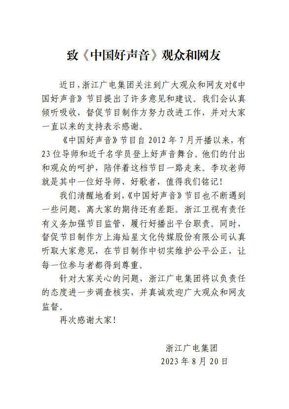 8月20日,浙江广电正式发文表示将调查此事。
