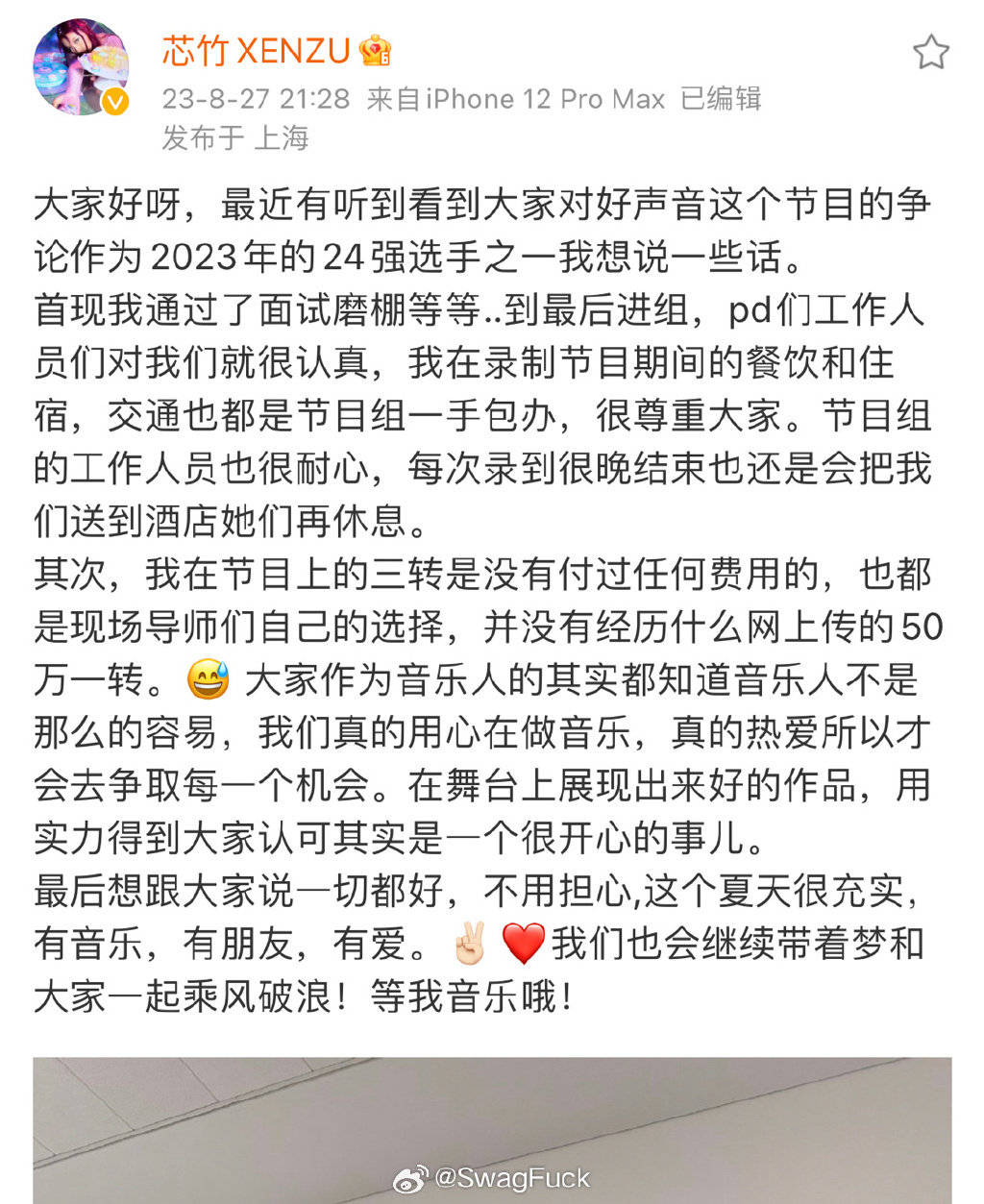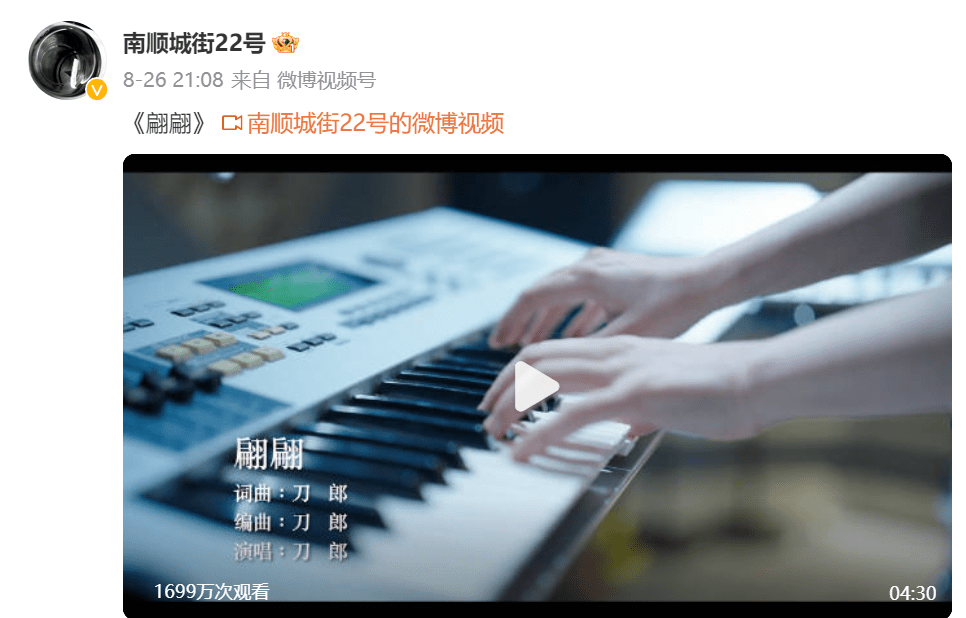 8月26日,微博上也是同步了《翩翩》,这是其时隔七年再度发微博,不过后续并未再同步其它歌曲。