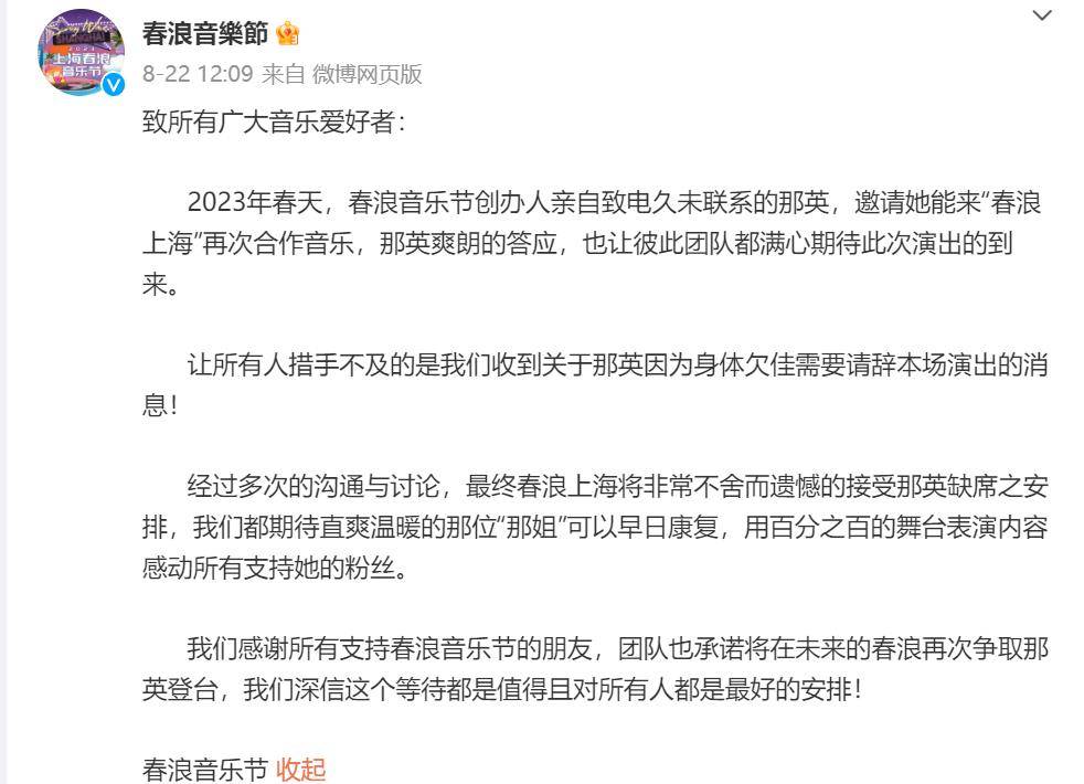 8月22日,春浪音乐节官方发文称“那英因为身体欠佳”请辞春浪上海站的演出。