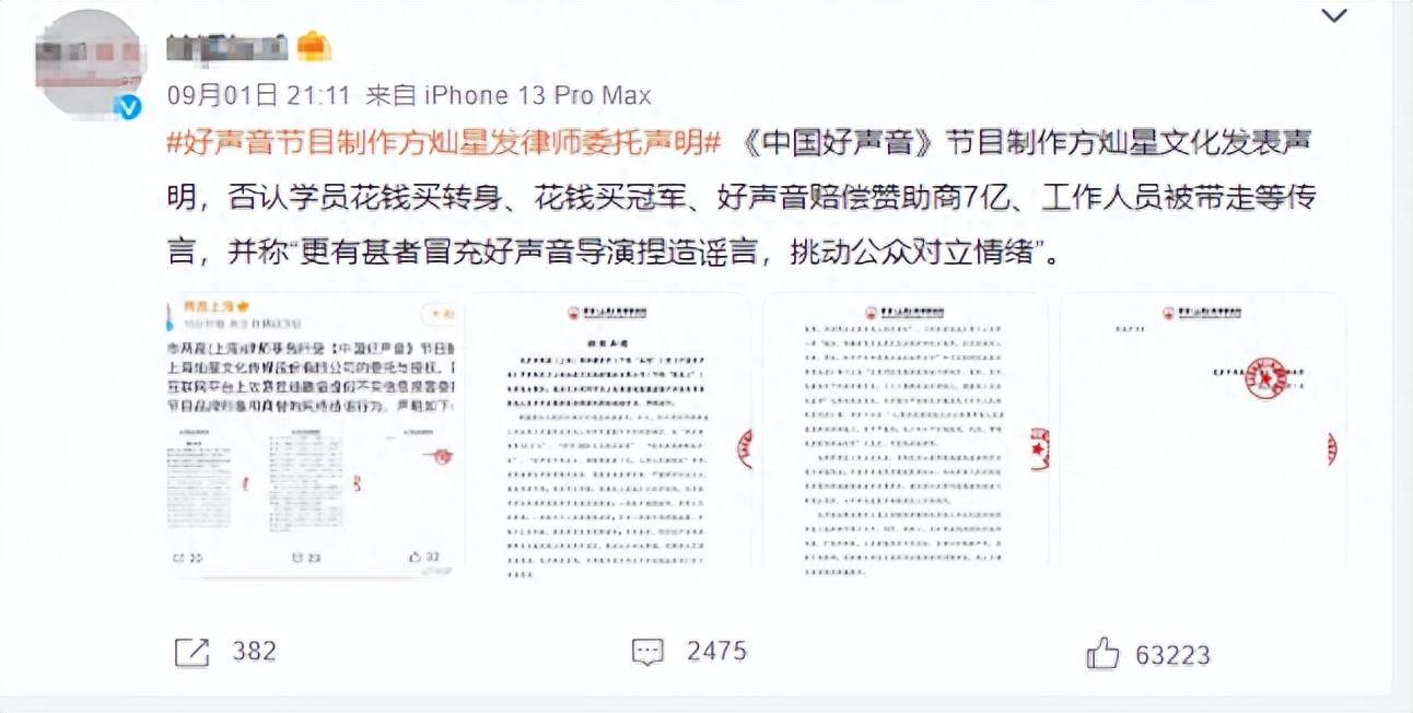 《好声音》节目组反击!委托律所发表声明,否认网上谣言并警告造谣者。3000万买冠军。华少被带走调查。导师退出节目。一个转身50万。
