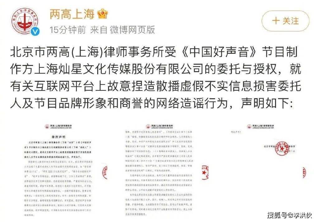 同时他们还表示,要依法追究造谣者的责任,相关造谣者立刻删除谣言,并且向《好声音》的制作方星灿道歉。