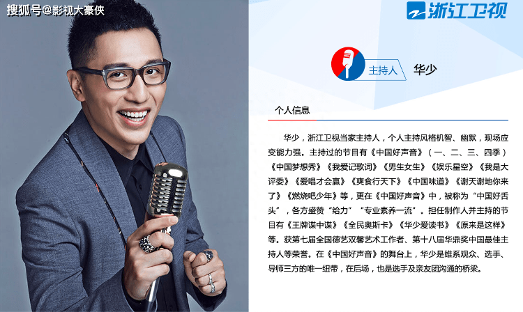 据了解,华少本名胡乔华,浙江卫视当家主持人,个人主持风格机智、幽默,现场应变能力强。主持过的节目有《中国好声音》(一、二、三、四季)《中国梦想秀》《我爱记歌词》《男生女生》《娱乐星空》《我是大评委》《爱唱才会赢》《爽食行天下》《中国味道》《谢天谢地你来了》《燃烧吧少年》等。