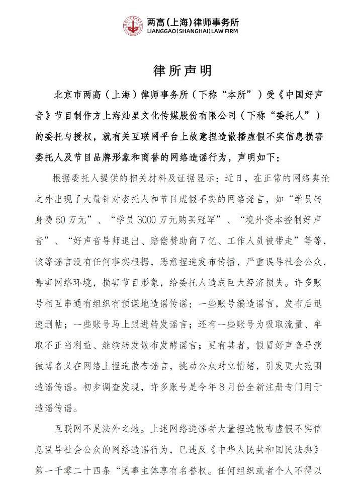 9月1日,好声音节目制作方灿星文化委托国内一家顶尖律师事务所对外发布律所声明,针对近期网络上疯传的各种虚假信息进行辟谣,并表示已经对大量造谣者侵权行为网络取证以及证据保全,后续将依法起诉至法院追究造谣者的法律责任。