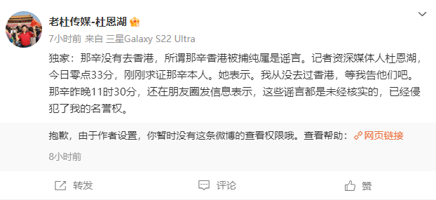 那辛指出,未经核实的谣言极其不负责任,欺骗大众伤害无辜,已侵犯她的名誉权,将会交给律师取证,感谢大家的关心。