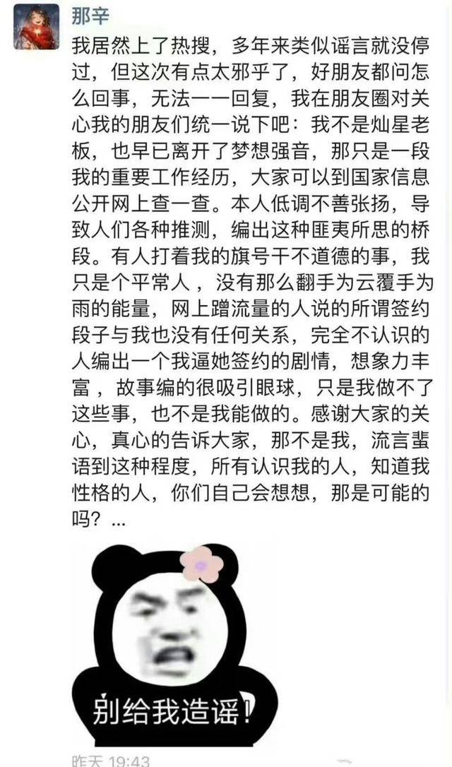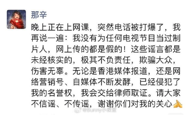 与此同时,那辛在1日晚11时于朋友圈发文辟谣,称自己上网课时电话被打爆,在此澄清“我没有为任何电视节目当过制片人,网上传的都是假的。”