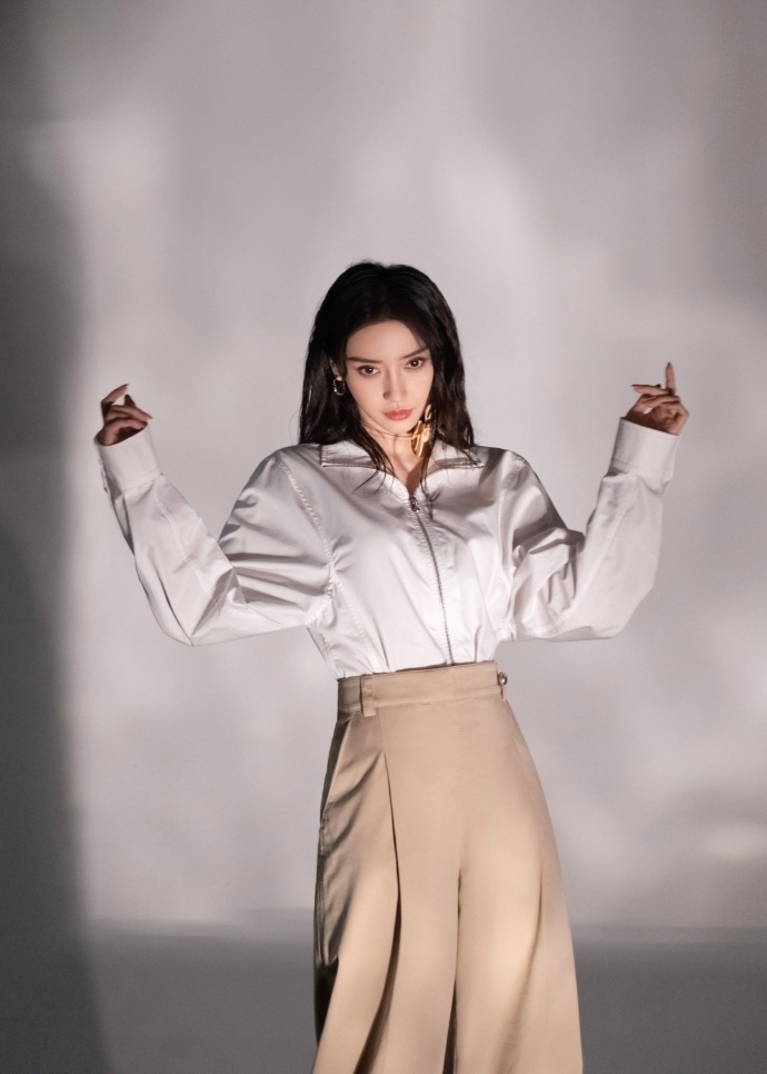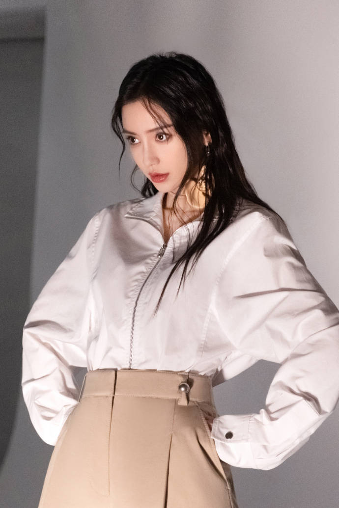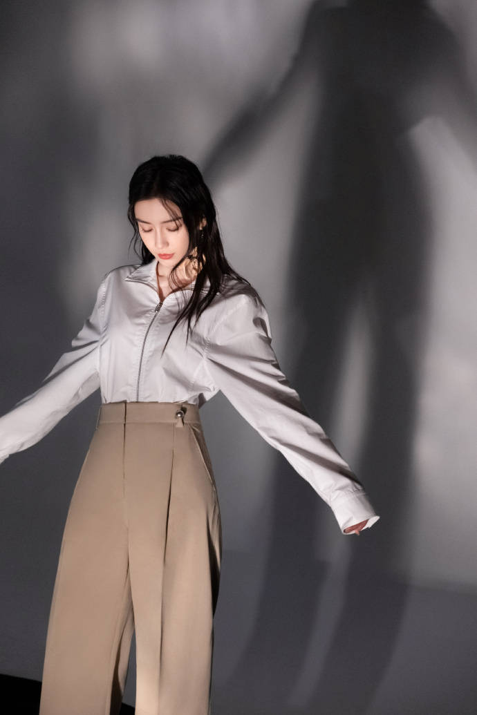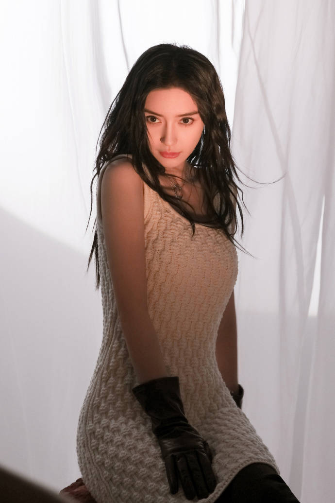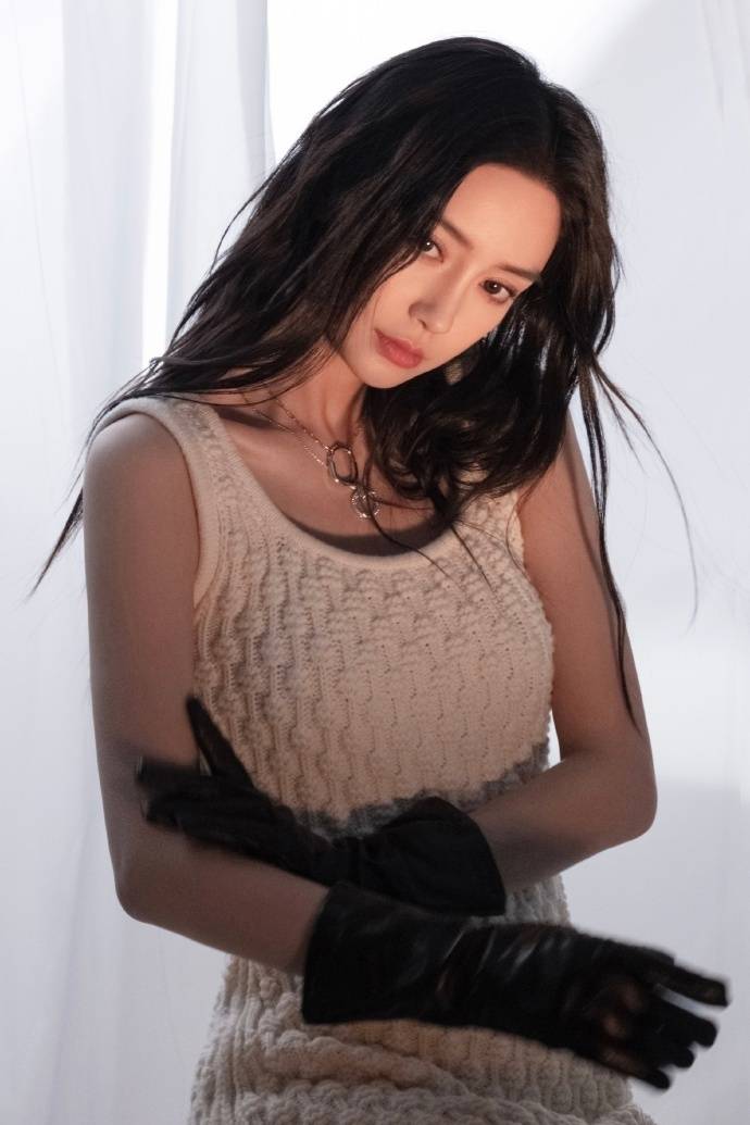画面中的Angelababy穿着白色的针织背心连衣裙,搭配黑色的紧身裤,手上还戴着黑色的手套,再加上一头湿润的长发披肩,简约的穿搭也依旧能够引领时尚潮流了。