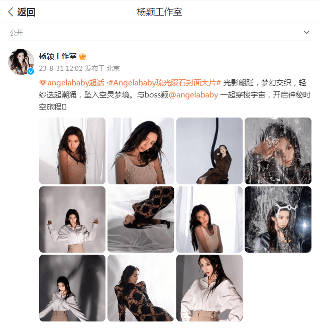 近日,Angelababy也再度登上了某时尚杂志的封面,再次以实际行动彰显了她的独有魅力。当天杨颖工作室也分享了一组拍摄花絮美照,并为此配文:“光影翩跹,梦幻交织,轻纱迭起潮涌,坠入空灵梦境。与boss颖一起穿梭宇宙,开启神秘时空旅程”,这也受到了网友们的广泛关注。