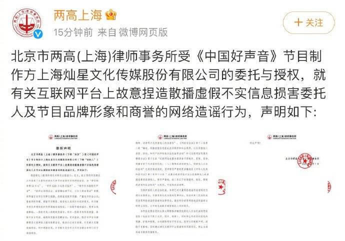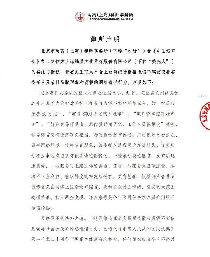 搜狐娱乐讯 9月1日,北京市两高(上海)律师事务所受《中国好声音》节目制作方上海灿星文化传媒股份有限公司的委托与授权,就有关互联网平台上故意捏造散播虚假不实信息损害委托人及节目品牌形象和商誉的网络造谣行为发表声明,否认学员花钱买冠军等传言。