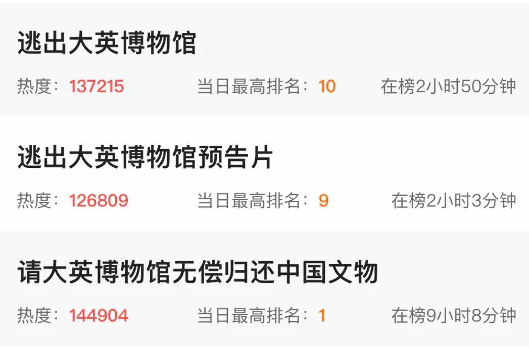 近日,大英博物馆因被曝约2000件馆藏文物莫名其妙失踪,微博话题 #请大英博物馆无偿归还中国文物# 登顶热搜,#逃出大英博物馆预告片# #逃出大英博物馆# 分别因该话题冲上热搜第9位、第10位。
