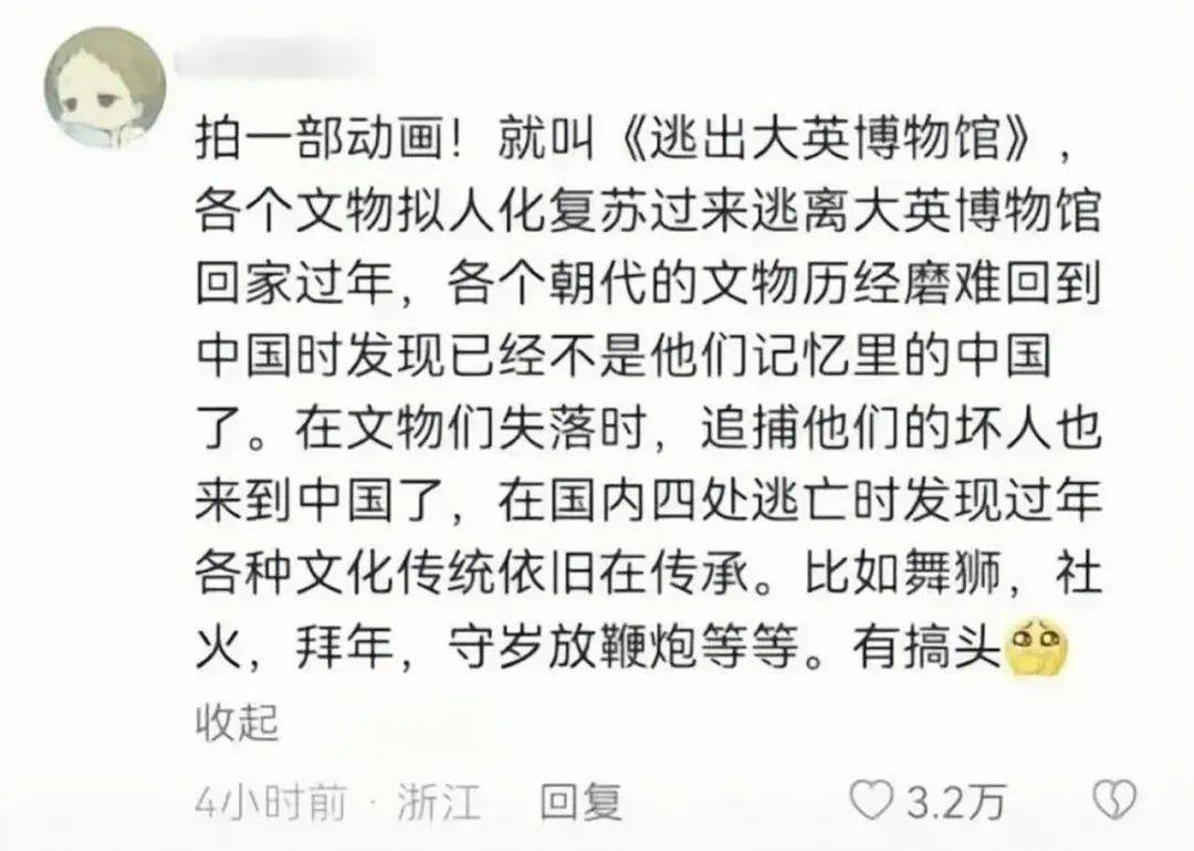 #逃出大英博物馆# 起源于网友提议拍一部名为《逃出大英博物馆》的动画,讲述各个文物拟人化后历经磨难逃离大英博物馆回家过年的故事。