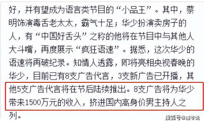 并且,早在一档节目中,华少就曾自曝自己有3-4套房产,如今怕早已是翻了几番了吧!并且这些年,他的广告代言是来者不拒,从餐饮、家电、腕表到保险,他纷纷收入囊中,所早已经赚得盆满钵满了。因此,虽不知道上边那个被带走调查的瓜是真是假,但华少这些年早已是惹了很多争议了。