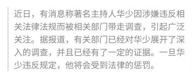 搜狐娱乐讯 9月1日据媒体报道,《中国好声音》主持人华少因涉嫌违反相关法律法规疑似被相关部门带走调查,还有疑似浙江律师所工作人员爆料这个消息是真的,并称华少整个人很憔悴。