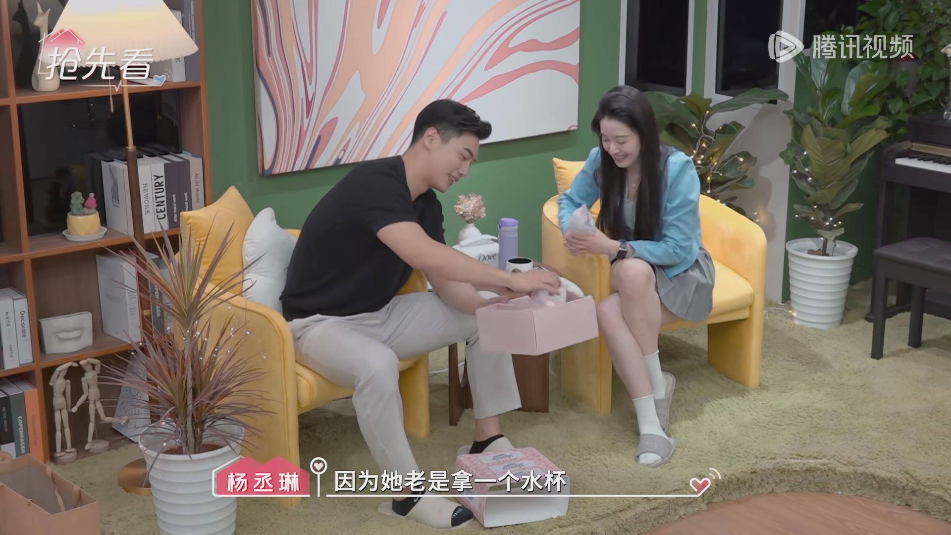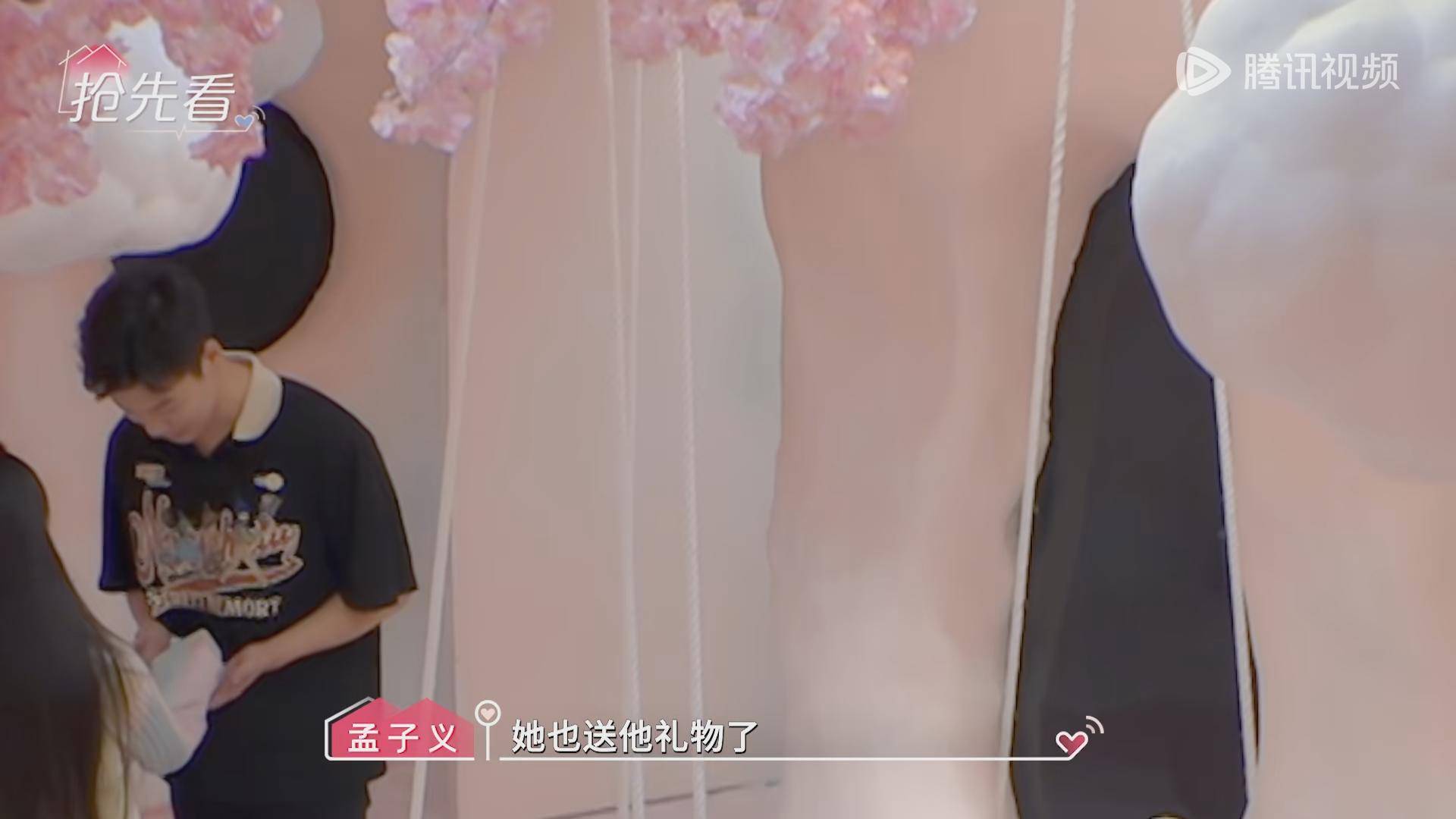 吃完后,镜头切换到王垲智送范依岚水杯,因为前面有提到范依岚的水杯砸得有些凹凸不平,可见王垲智还是挺细心的。另外,还有一个礼物就是兔子书包,有可能是王垲智之前“张飞绣花”的成品。收到礼物的范依岚脸都红了,看起来非常的开心的样子。