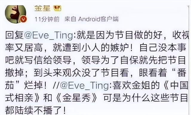 金星曾透露《中国式相亲》《金星秀》为何不播出,那就是因为节目做得好,收视率又居高,就遭到小人的嫉妒,自己没本事就写信给领导,领导为了自曝就把节目给撤掉了,到头来观众没了节目看,眼看着“番茄”烂掉!