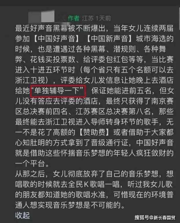 一名网友透露女儿曾参加《中国好声音》海选,曾遭遇黑幕、潜规则、舞弊、花钱买投票数,提到每个省只有5个名额可以去到电视台录制,当时女儿在十进五环节时,有一位评委给她发信息,让她晚上去酒店“单独辅导一下”,保证能让她进前五名,疑似表明用身体就能换机会,但女儿没有答应去,所以最后只获得了南京赛区的前四名和江苏赛区的第八名,他指出“那些最终能去浙江卫视进入导师转身环节的歌手,无一不是花了高额的赞助费或者借助大家都心知肚明的方式拿到了晋级通行证,中国好声音就是借助这些怀揣音乐梦想的年轻人疯狂敛财的一个平台”。该网友表示那次经历后,女儿就彻底放弃了音乐梦想,惋惜现在的环境不可能让普通人实现音乐梦想。言论曝光后,网友们发表看法:“坏声音永久停播吧”、“确实过分了”、“反正我不看了”。