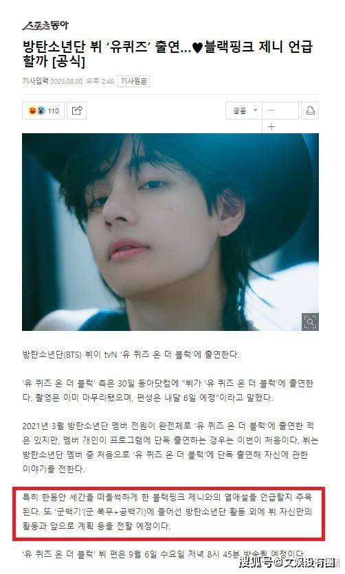 除此之外,该记者还将文章标题定为“BTS V现身‘You Quiz'’...他会提及BLACKPINK的Jennie吗?”