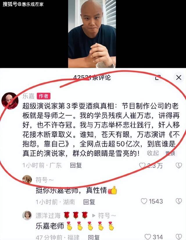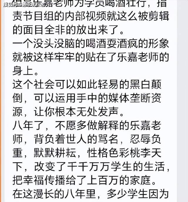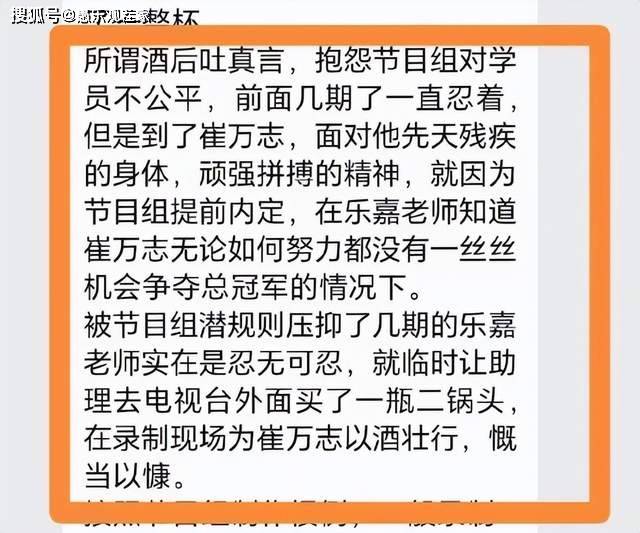 在乐嘉澄清真相后,还有业内人士发文力挺乐嘉,并道出其中内幕。这位知情人表示,当时乐嘉在《超级演说家》中带的学员是残疾人,但节目组不允许他夺冠。乐嘉一边为学员鸣不平,但自己又无力改变,在某一期节目中,他到场外买了一瓶二锅头,私底下给学员践行。没想到录制之外的视频,却遭到节目组恶意剪辑,给乐嘉塑造了负面的形象。
