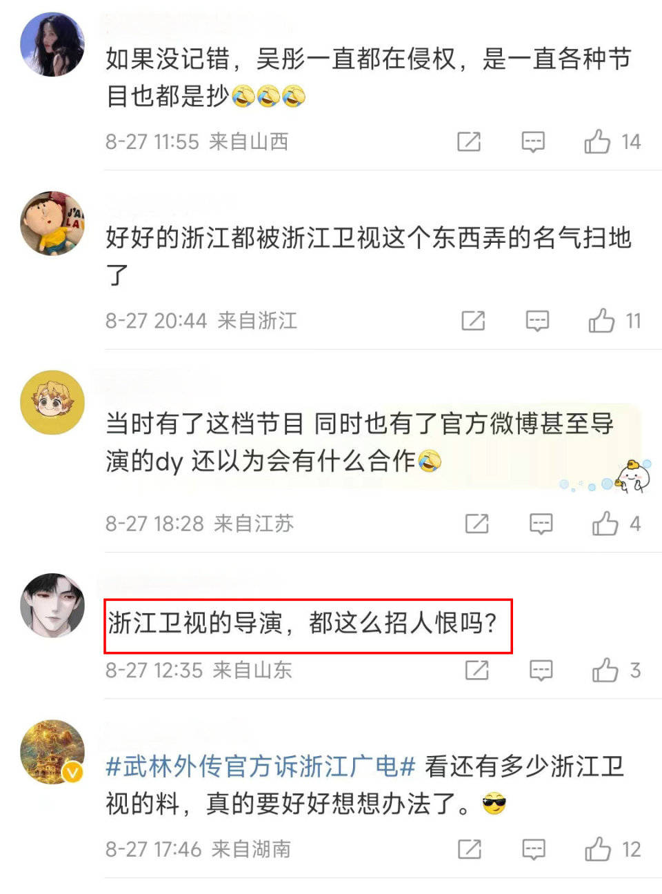 有人称赞《武林外传》干得漂亮,有人嘲讽浙江卫视咎由自取,还有人感慨墙倒众人推……