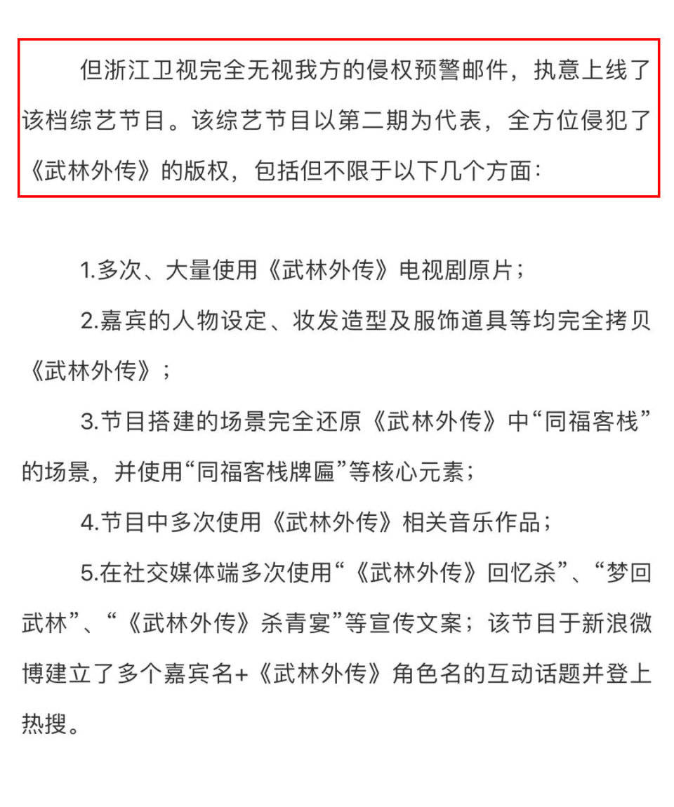 《武林外传》方面还直指,除了《我们的客栈》,之前的《王牌对王牌》《青春环游记》中涉及《武林外传》的元素,也未获得授权。