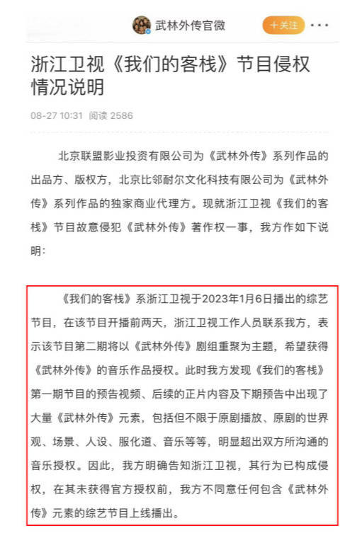 8月27日,《武林外传》官微发文,控诉浙江卫视的综艺节目《我们的客栈》侵权。