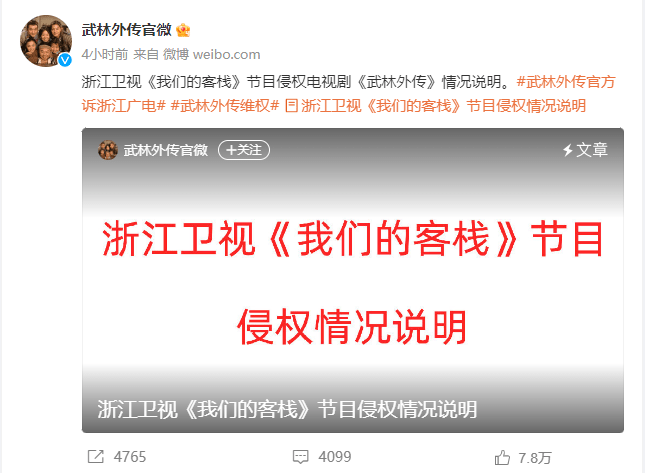 8月27日,电视剧《武林外传》的版权方发布声明称,浙江卫视的综艺节目《我们的客栈》曾联系版权方,希望获得这部电视剧的音乐授权,但版权方发现,这档综艺和浙江卫视的很多综艺节目,均存在对于《武林外传》的侵权行为,因此,并未授权浙台相关版权。《武林外传》版权方发布声明称: