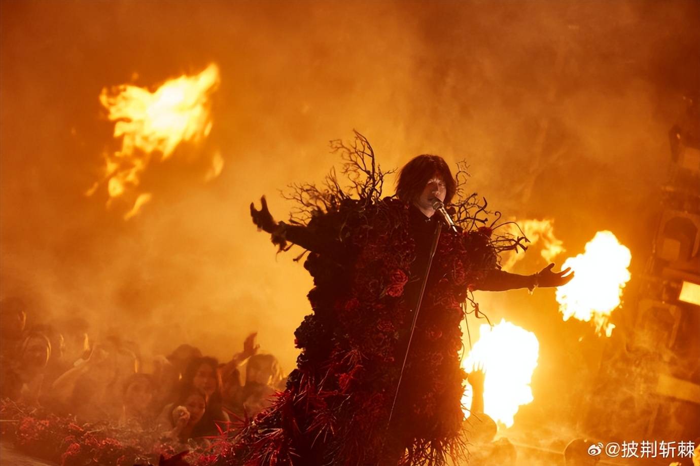 当他披着一百多斤,带着无数荆棘和玫瑰花的造型站在舞台上,幽深的舞台,梦幻的造型,那种肃杀而又震撼人心的电影感扑面而来。