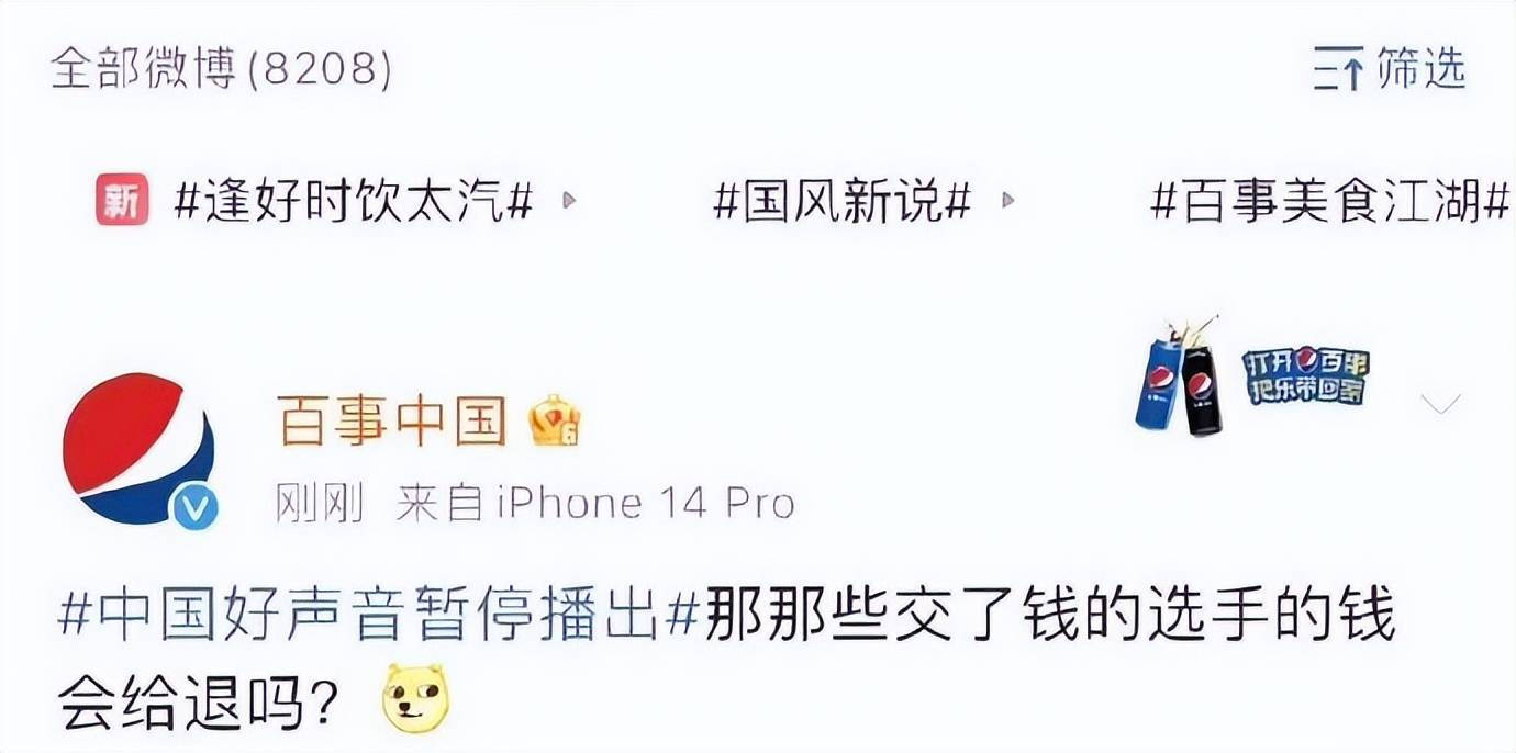 在宣布停播后,百事的官博还发声表示:“那些交了钱的选手的钱会给退吗?”,随后运营可能发现自己切错号了,赶忙删除了这条动态。