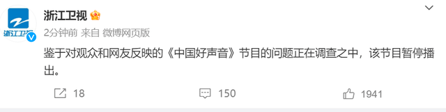 其实在这个事件刚发生后,就曾有媒体问询过节目组会不会选择停播,当时节目组表示不会停播,会照常播出,并且表示相关单位对《中国好声音》充分肯定,制作组也会用优质的作品回馈观众和社会。当时能看出节目组还是比较强硬的。