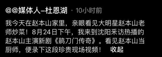 资深娱乐记者杜恩湖近日在社交平台上晒出一则视频,配文:我今天在赵本山家里,亲眼看见大明星赵本山老师炒菜!8月24日下午,我来到沈阳采访热播的新剧《鹊刀门传奇》,看见赵本山当厨师,便录下这段珍贵现场视频。此视频一出后,很快引起很多网友的围观。
