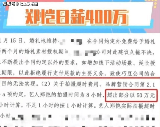 8月25日,网上流出一张郑恺部分合同的截图,虽然合同截得不完整,但还是能从文字中看清大致内容,上面清楚地写着合同中的A项约定,艺人郑恺的拍摄时间为8小时,超过部分以50万元每小时计算。不足一小时的,必须按1小时计算!