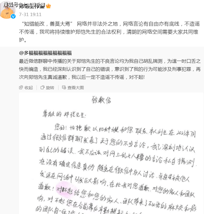 事后证实,被抓一事确系造谣,造谣者写悔过书致歉,郑恺转发后,决定给他一次机会。
