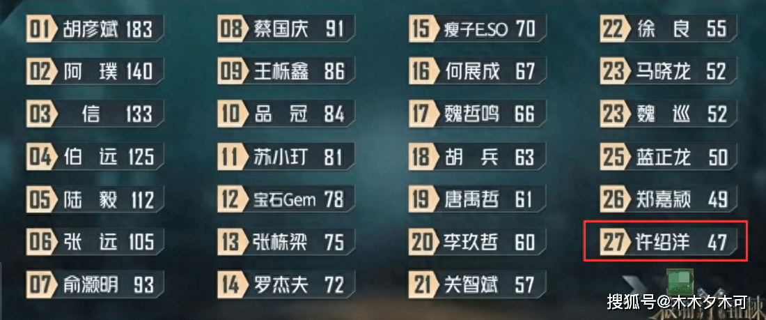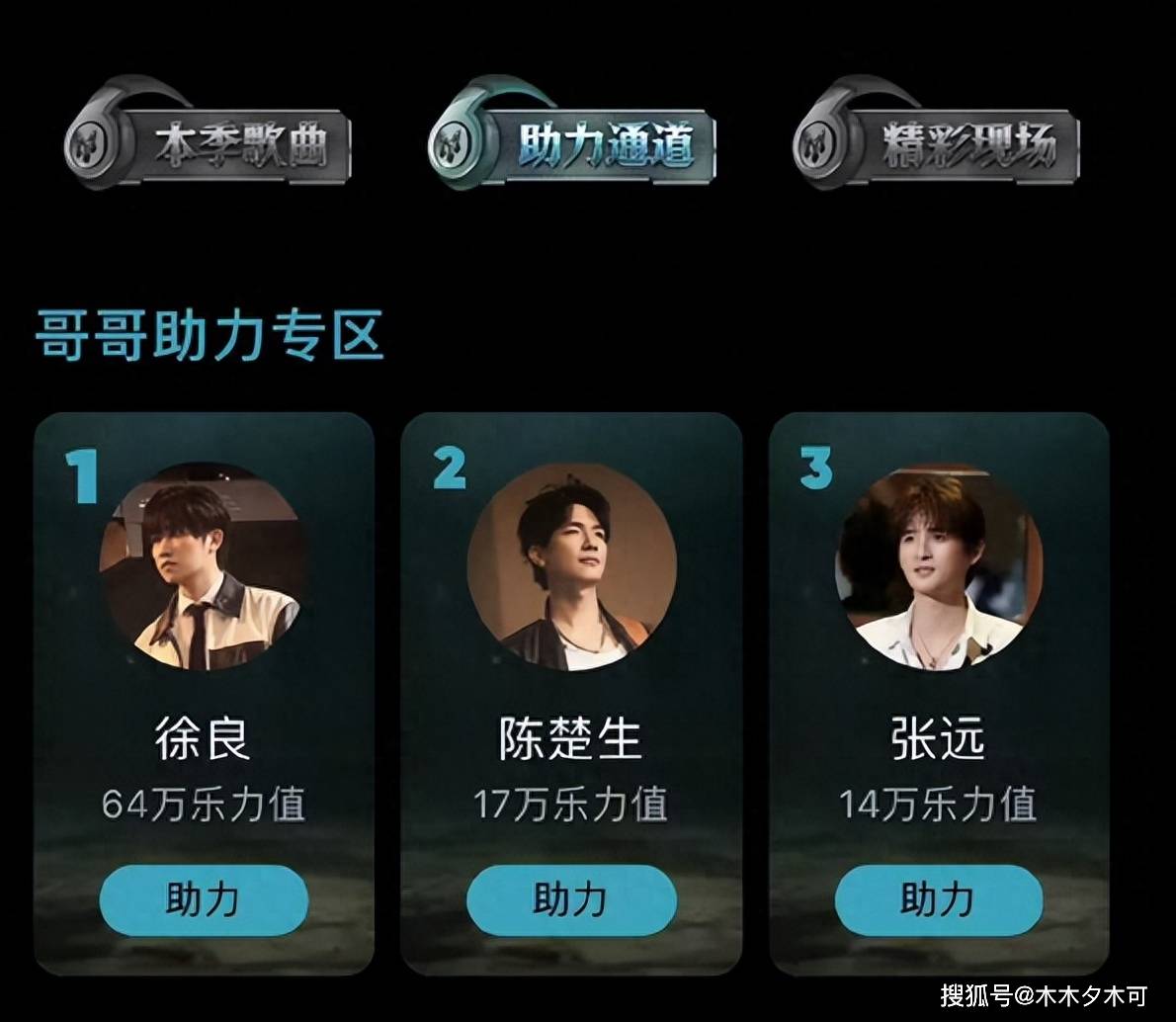 而其他的哥哥们则是沦为流浪者,不过也还是按照名次进行第一次公演的选歌,从数据可以看到,排在前面几位的则有胡彦斌,阿噗,信,张远,陆毅,俞灏明,伯远,而排在末位的则有魏巡,马晓龙,蓝正龙,郑嘉颖,名次垫底的则是许绍洋,他的火力值只有47分。