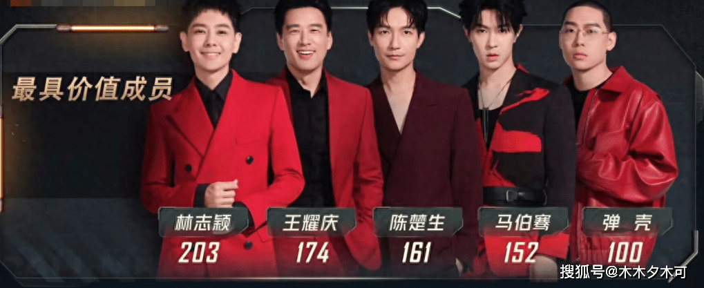所有舞台结束后,哥哥们的初舞台成绩也相继出炉了,对比之下差距就拉开了,获胜的五个小组内会产生一位最具价值成员,也就是得票最高的成员,他们分别是林志颖,王耀庆,陈楚生,马伯骞,弹壳,他们五位的活力值均在100之上。